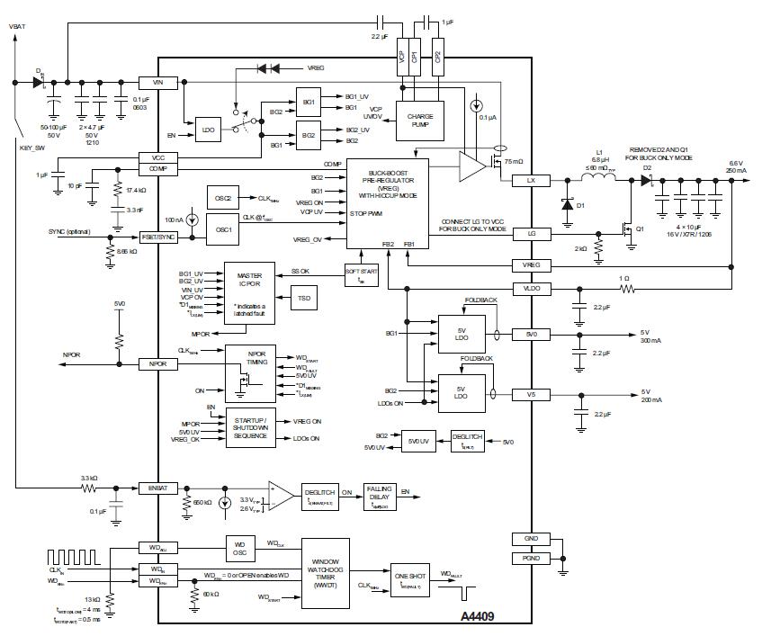 设备诊断输出包括加电复位输出 (NPOR),典型固定延迟为 22.5?ms。双带隙一个用于稳压一个用于故障检查,可以提高围绕 A4409 设计的系统的长期稳定性。