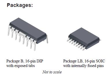 内部电路保护包括带时延的过热关机、瞬态抑制二极管及交叉电流保护。不需要特别的加电排序。 A4975 有两种功率封装可供选择:带铜散热片(后缀 B)的 16 引脚双列直插式塑料封装,和带内部保险丝引脚(后缀 LB)的 16 引脚塑料 SOIC。两种封装都有散热良好的引脚并已接地,无需电气绝缘。 两种封装均为无铅封装,采用 100% 雾锡镀层引脚框。