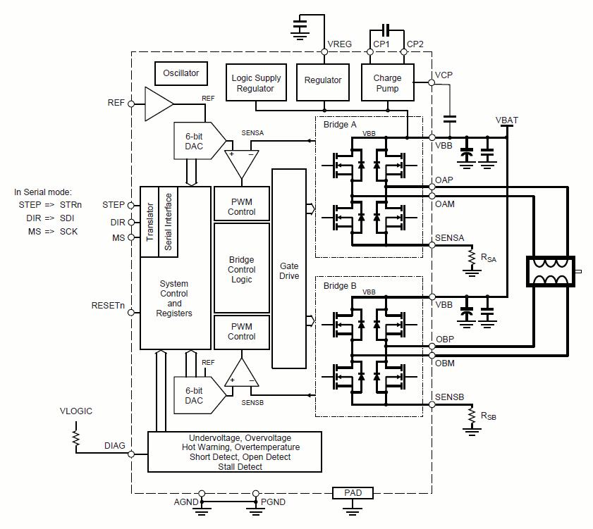 电动机中各相电流均通过 DMOS 全桥式装置进行控制,使用同步整流,减少功率耗散。在高侧驱动和低侧驱动之间切换时,内部电路和计时器可防止跨导和击穿。