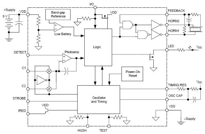 可变增益光学放大器可直接与红外发射器-探测器对交互。放大器增益水平由两个外置电容确定,并根据运行模式在内部进行选择。在待机和计时器模式中选择低增益。 当发生本地告警时,低增益将(内部)提高约 10%,以降低错误触发。在按键测试或待机模式中定期监控光室敏感度时采用高增益。