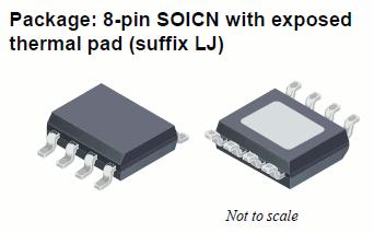 该器件采用带外露隔热盘的 8 引脚 SOIC(封装 LJ)封装,以增强散热。其封装为无铅 (Pb) 产品,且采用 100% 雾锡电镀引脚框。